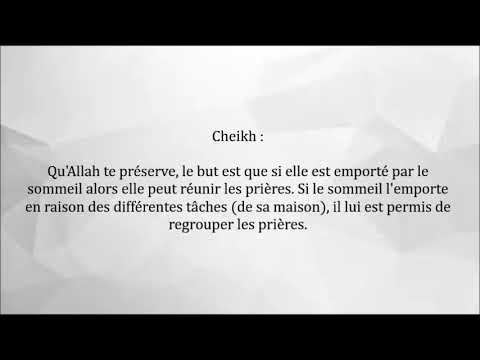 Cheikh: Qu'Allah te préserve, le but est que si elle est emporté par le sommeil alors elle peut réunir les prières. Si le sommeil l'emporte en raison des différentes tâches (de sa maison), il lui est permis de regrouper les prières.