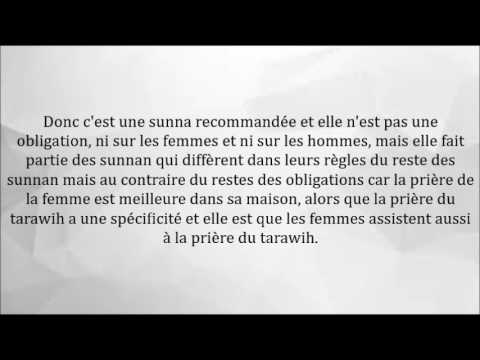 Donc c'est une sunna recommandée et elle n'est pas une obligation, ni sur les femmes et ni sur les hommes, mais elle fait parti des sunnan qui diffèrent dans leurs règles du reste des sunnan mais au contraire du restes des obligations car la prière de la femme est meilleure dans sa maison, alors que la prière du tarawih a une spécificité et elle est que les femmes assistent aussi à la prière du tarawih.